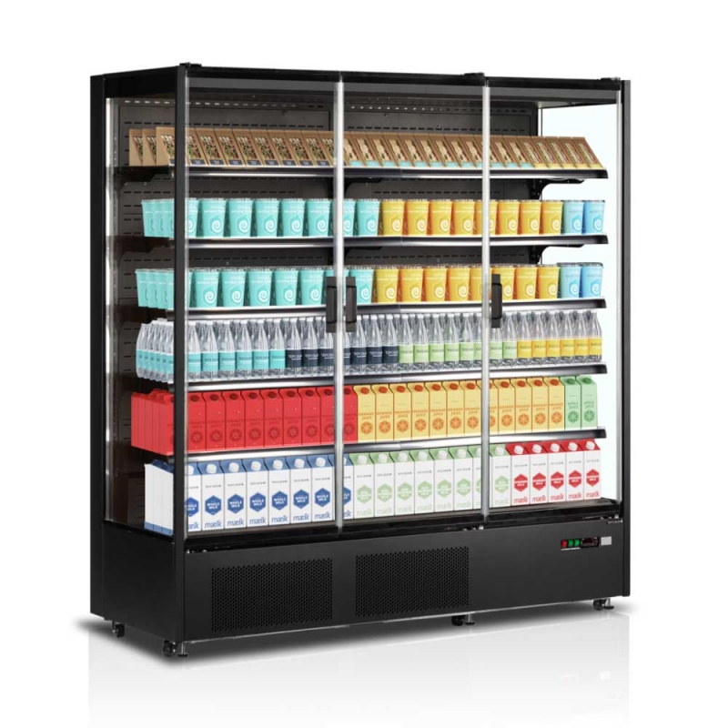 La gamme PC de vitrines réfrigérées à froid positif mise tout sur la visibilité des produits, avec ses portes vitrées sans montant et ses parois également vitrées.