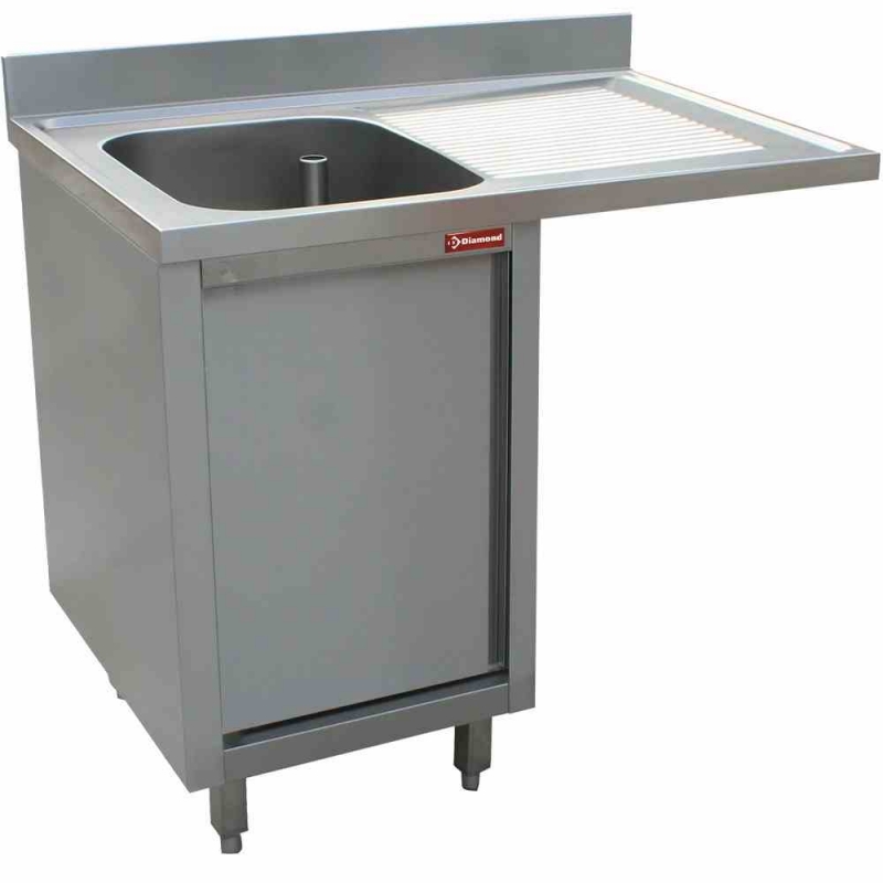 Le plan supérieur est embouti avec un dosseret arrière de 100 mm. La dimension de la cuve est de 600 x 500 x 325 mm. Le fond extérieur des cuves est revêtu d'un isolant phonique. La porte est battante et la tablette renforcée.