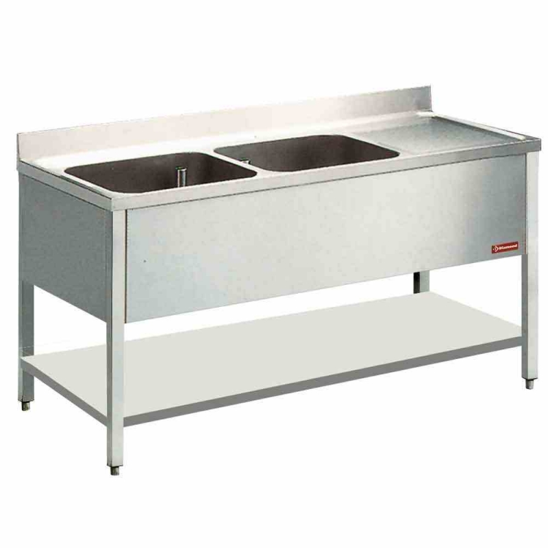 C'est une plonge murale inox de 2 cuves + 1 égouttoir à droite, avec une tablette inférieure. Elle est équipée d'une crépine et bonde de trop-plein, de vérins en inox réglables et d'un dosseret arrière de 100 mm. La plonge de profondeur 700 mm, possède une structure soudée et un plan supérieur embouti.