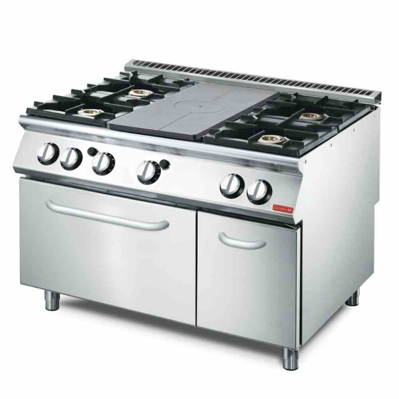 Plaque coup de feu avec 4 feux vifs sur four gaz. PCF avec un brûleur central, allumage piezo, veilleuse et thermocouple. Feux vifs avec veilleuse et thermocouple. Four à gaz spacieux et pratiques, compatibles GN 2/1 avec thermostat, thermocouple et allumage piezo. Pieds réglables.