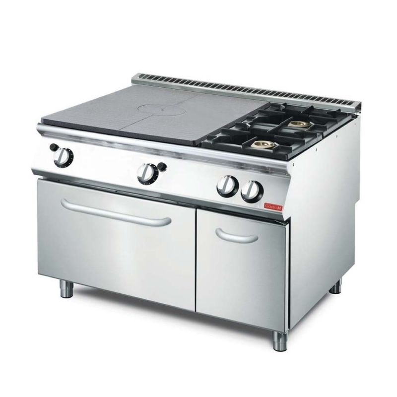 Plaque coup de feu avec 2 feux vifs sur four gaz. PCF avec un brûleur central, allumage piezo, veilleuse et thermocouple. Feux vifs avec veilleuse et thermocouple. Four à gaz spacieux et pratiques, compatibles GN 2/1 avec thermostat, thermocouple et allumage piezo. Pieds réglables. Dimensions intérieures du four 289(H) x 576(L) x 662(P) mm. Produit nécessitant obligatoirement une installation par un professionnel pour bénéficier de la garantie.