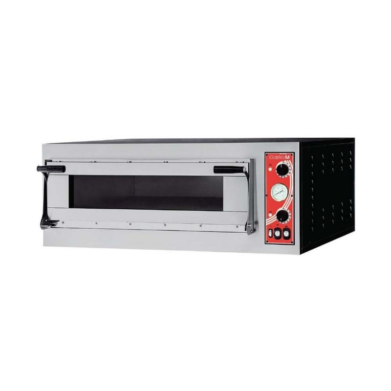 Four à pizza avec extérieur inox et plan de cuisson en pierre réfractaire pour une cuisson efficace. Chaque chambre peut contenir quatre pizzas (Ø 35 cm max) et possède un thermostat indépendant pour la sole et la voûte. Avec commutateur Marche-Arrêt, thermostat de sécurité et témoin lumineux. Plage de température 50 à 500°C. Isolation en laine de roche évaporée. Résistances cuirassées. Éclairage intérieur.