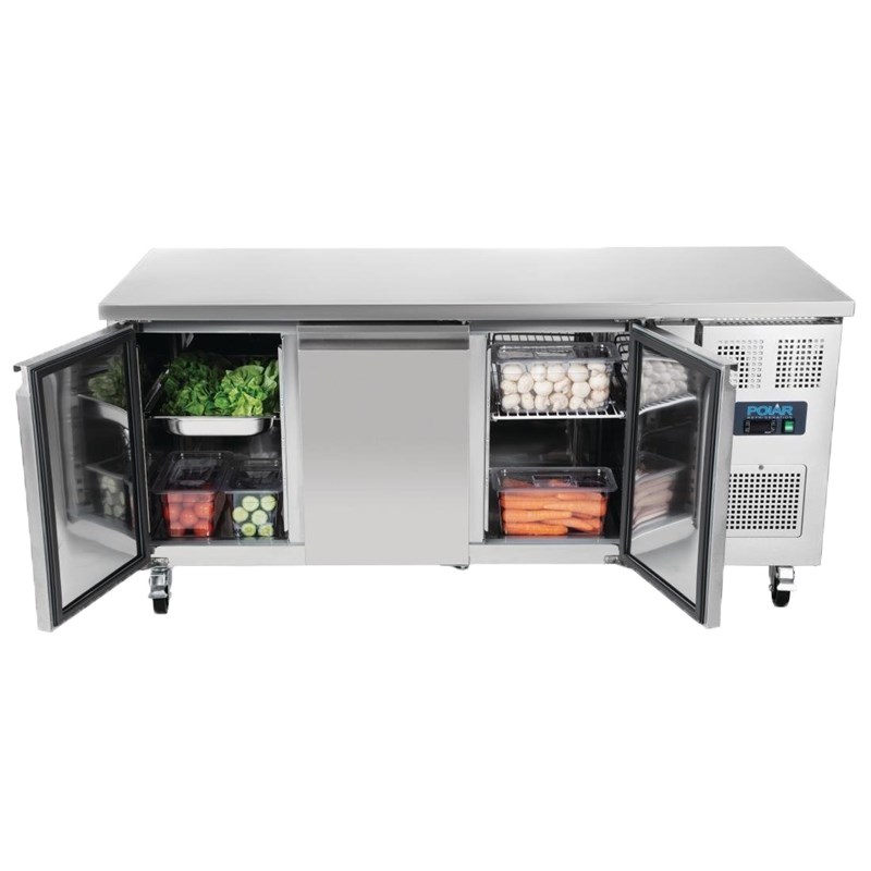 Équipée de six étagères réglables de série, la table Polar haut de gamme facilite le stockage et l'accès aux ingrédients. Et grâce à la compatibilité GN 1/1, vous pouvez rapidement échanger les bacs, transférant les aliments directement dans une cellule de refroidissement, un four mixte ou une unité négative sans avoir à changer de contenant. Le refroidissement par air forcé assure que les températures baissent rapidement - même lorsque les portes sont ouvertes régulièrement - essentiel dans les cuisines professionnelles animées. Et à la fin d'un service chargé, la construction robuste en acier inoxydable et les roulettes intégrées permettent un nettoyage facile.