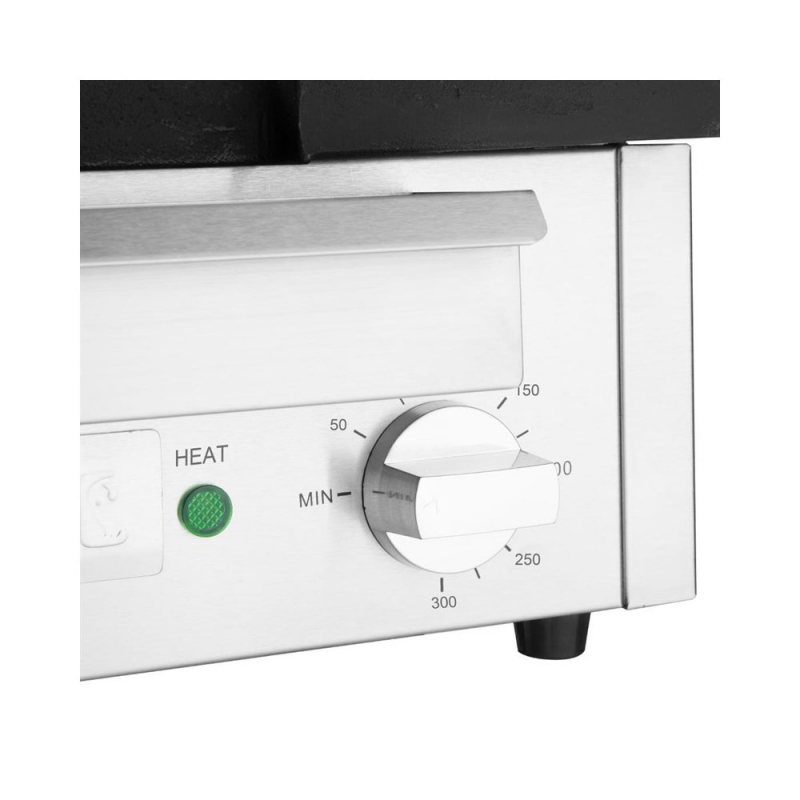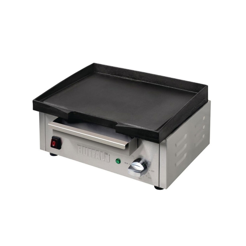 Avec sa plaque de cuisson en fonte très résistante de 385 x 280 mm, la plancha électrique de comptoir Buffalo est l'appareil idéal pour le service du petit déjeuner ou du dîner. Capable de cuire du bacon, des œufs, des saucisses et bien plus encore, la plaque de cuisson permet d'obtenir facilement d'excellents résultats. Après culottage, la surface de cuisson devient parfaitement antiadhésive et la résistance de 1,8 kW vous permet de cuisiner sans souci pendant les coups de feu.