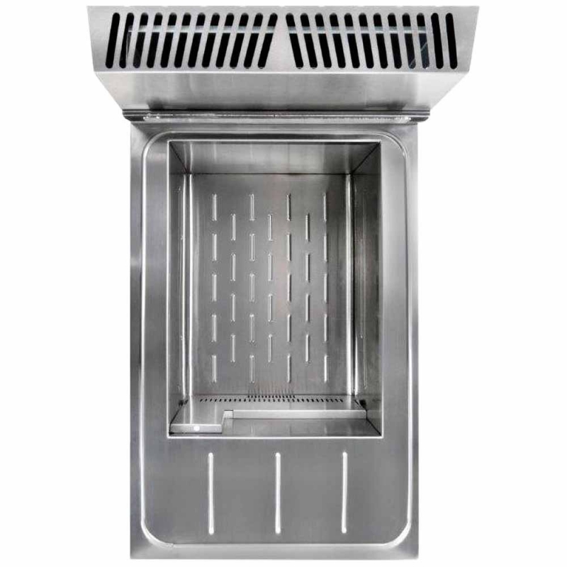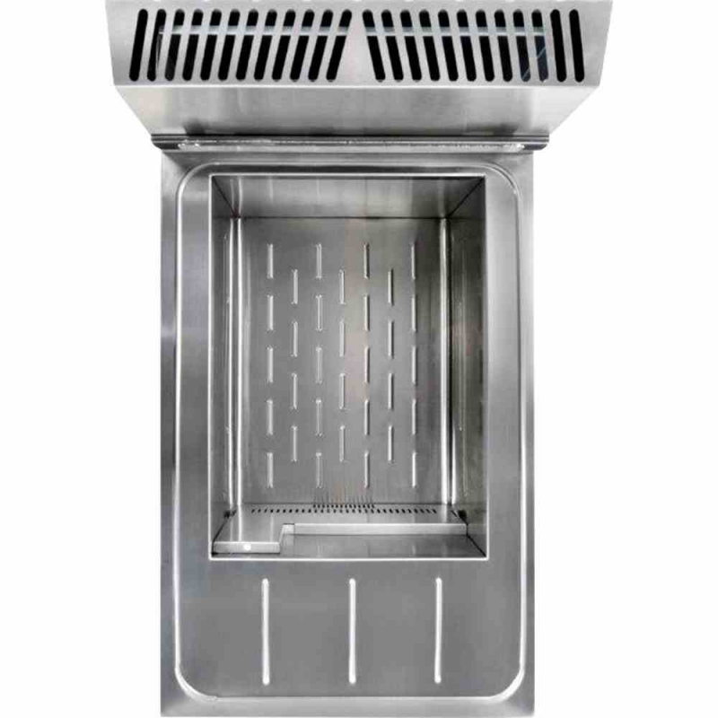 La fabrication est en inox, avec une cuve emboutie à fond incliné pour une vidange sans résidu d'huile, couvercle tout inox. La vidange se fait par un robinet à l'intérieur du meuble dans un bac avec filtre. L'allumage est piezzo avec une veilleuse de maintien. Le réglage de température est thermostatique jusqu'à 190°C, avec un thermocouple de sécurité. 2 brûleurs très puissants sont placés sous la cuve. La friteuse est equipée d'usine avec un injecteur butane/propane, l'injecteur gaz naturel est fourni dans un sachet à part.