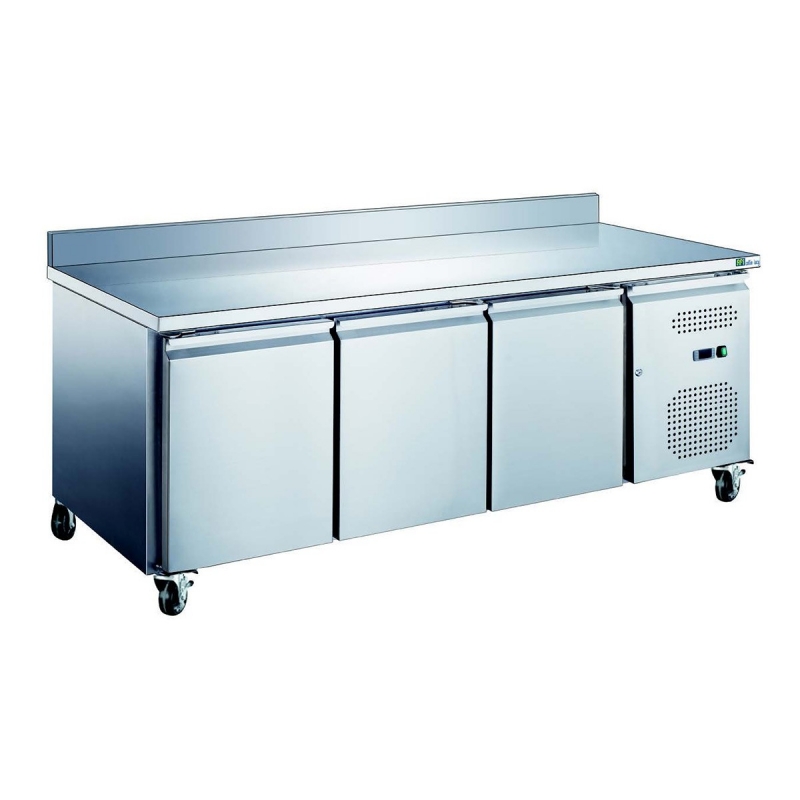 Cette table réfrigérée d'une profondeur de 600 mm répond aux exigences des professionnels avec une finition intérieure/extérieure en inox, avec des coins arrondis en bas pour un nettoyage facile. Les portes sont dotées d'une fermeture automatique très pratique lorsqu'on n'a pas les mains libres. Son dosseret arrière protège le mur contre lequel la table est adossée.