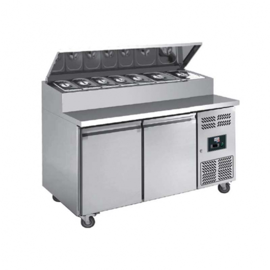 Meuble froid avec placards adaptés au rangement de bacs gastronomes (non-fournis) GN 1/3, profondeur 150 mm et d'une capacité de 390 L. Cette table réfrigérée centrale permet d'effectuer la préparation ou le dressage de vos plats sur un espace de stockage à réfrigération ventilée. Cette table est livrée sur roulettes.