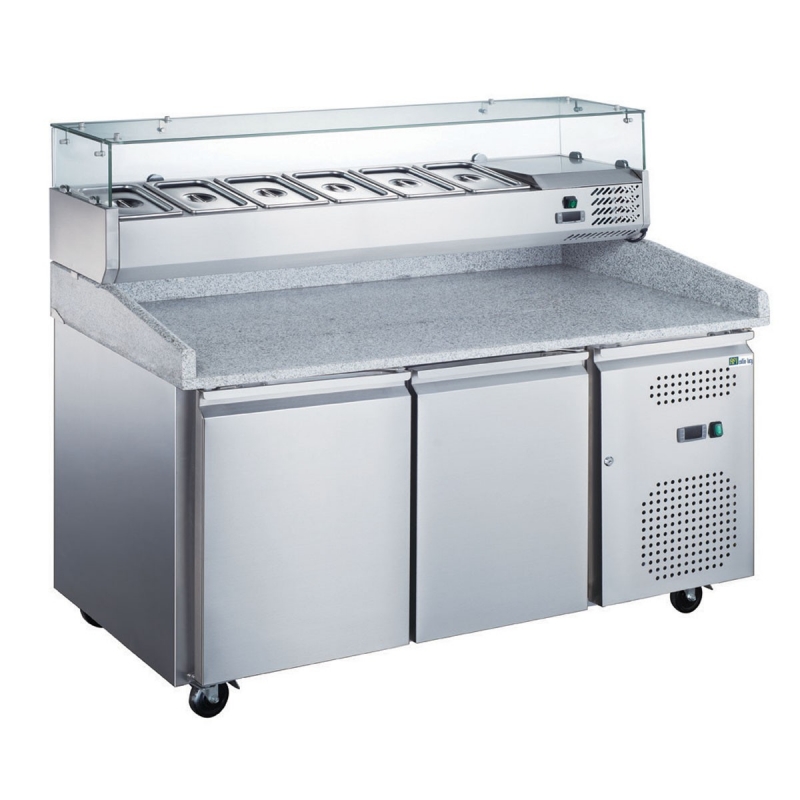 Table de préparation réfrigérée pour pizzas avec vitrine et plan de travail en granit